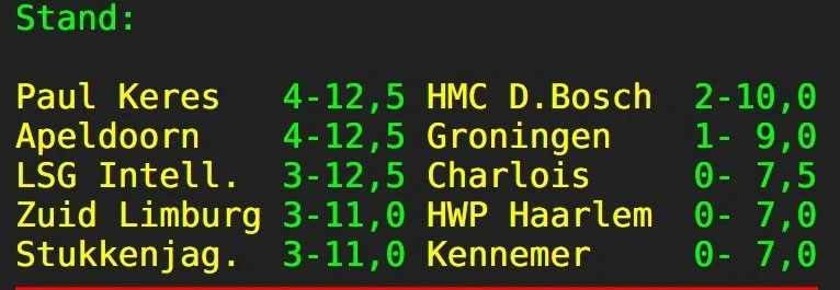 En Passant, enige jaren geleden een grootmacht in de schaakwereld en daarna in een vrije val beland, promoveerde naar de tweede klasse en gaat daarin mede aan de leiding. Tegen Spassky’s werd de tweede overwinning behaald (4,5-3,5). Henk Vedder, Robin Reichardt en Johannes Kossen wonnen namens de club uit Bunschoten/Spakenburg hun partij. Woerden heeft het net als vorig seizoen zwaar. Tegen Max Euwe 2 werd nog wel een punt gepakt, maar tegen Assen ging het team hardhandig onderuit (2-6). Alleen Marcel Schroër zorgde voor een lichtpuntje.